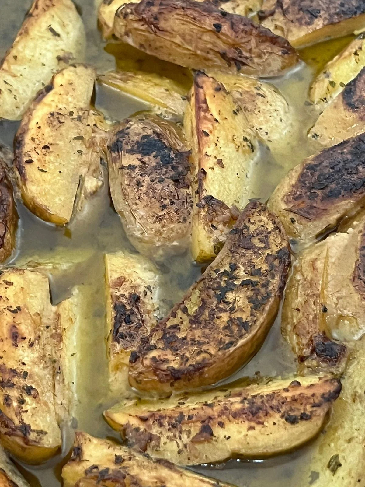 Cut potatoes in wedges and place in the dish with the sauce mixture